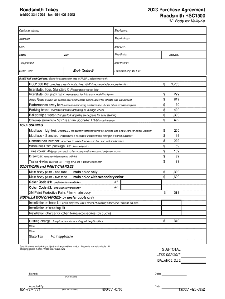 Roadsmith Trikes2023 Purchase Agreement Roadsmith HSC1500tel:8003310705 fax: 6514263952\"V\" Body for Valkyrie Customer Name:Ship Name:Address:Ship Address:City:Ship City:State:Ship State:Zip:Ship