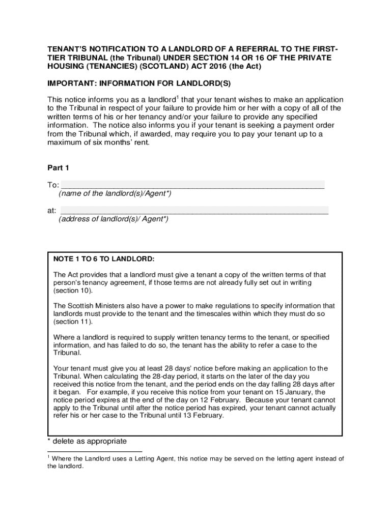 TENANTS NOTIFICATION TO A LANDLORD OF A REFERRAL TO THE FIRSTTIER TRIBUNAL (the Tribunal) UNDER SECTION 14 OR 16 OF THE PRIVATE HOUSING (TENANCIES) (SCOTLAND) ACT 2016 (the Act) IMPORTANT: INFORMATION