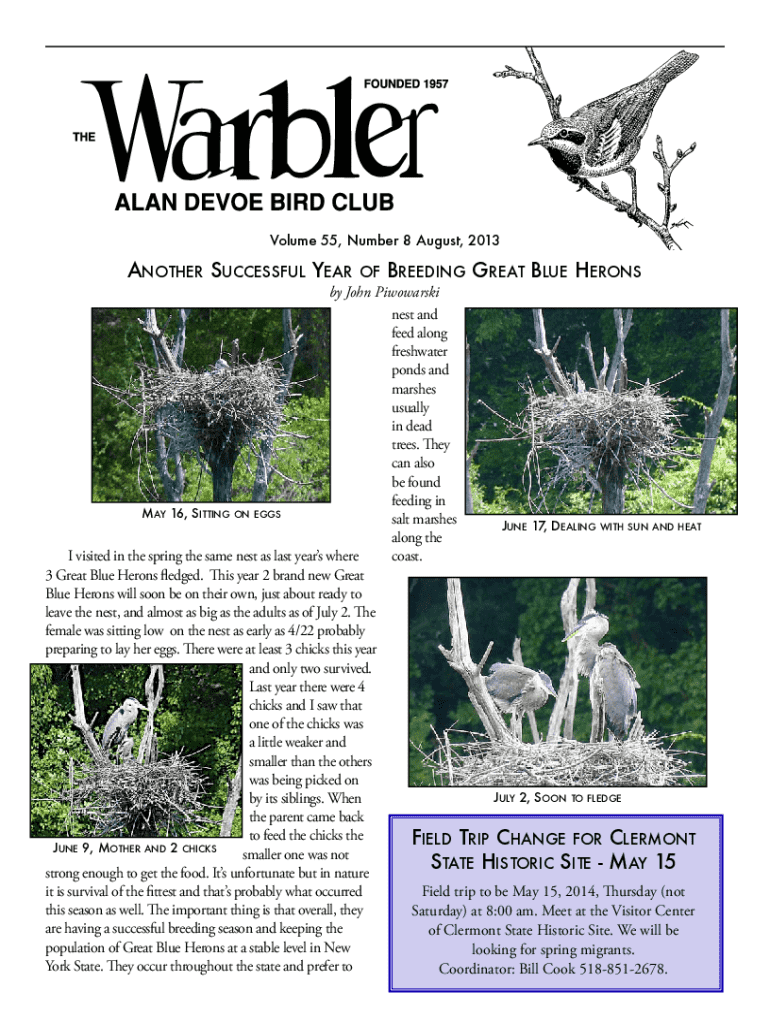 Volume 55, Number 8 August, 2013Another Successful Hereof Breeding Great Blue Herons by John Piwowarski nest and feed along freshwater ponds and marshes usually in dead trees. They can also be found