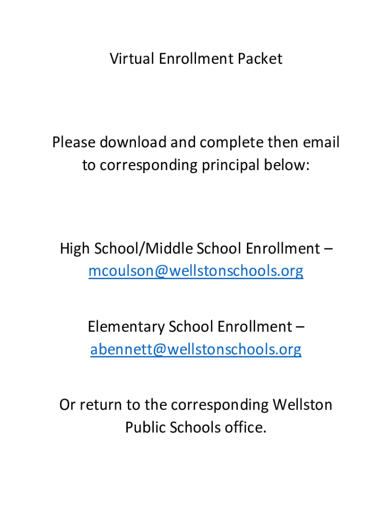 Virtual Enrollment PacketPlease download and complete then email to corresponding principal below:High School/Middle School Enrollment mcoulson@wellstonschools.org Elementary School Enrollment abennett@wellstonschools.org