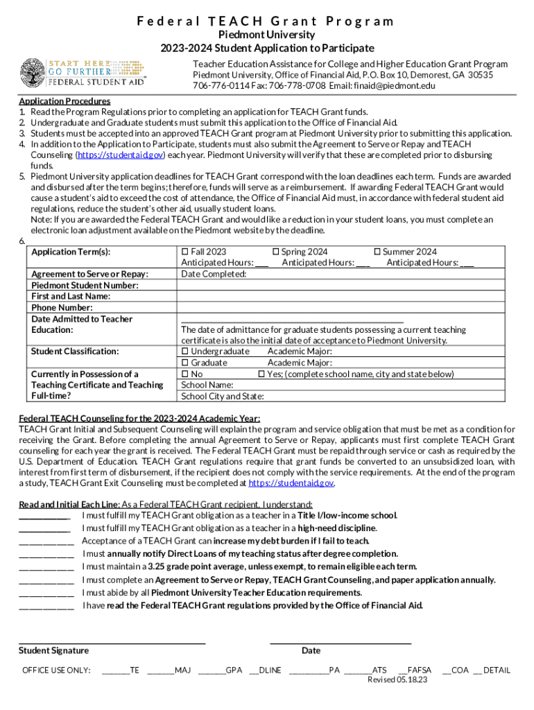 Federal TEACH Grant Program Piedmont University 20232024 Student Application to Participate Teacher Education Assistance for College and Higher Education Grant Program Piedmont University, Office
