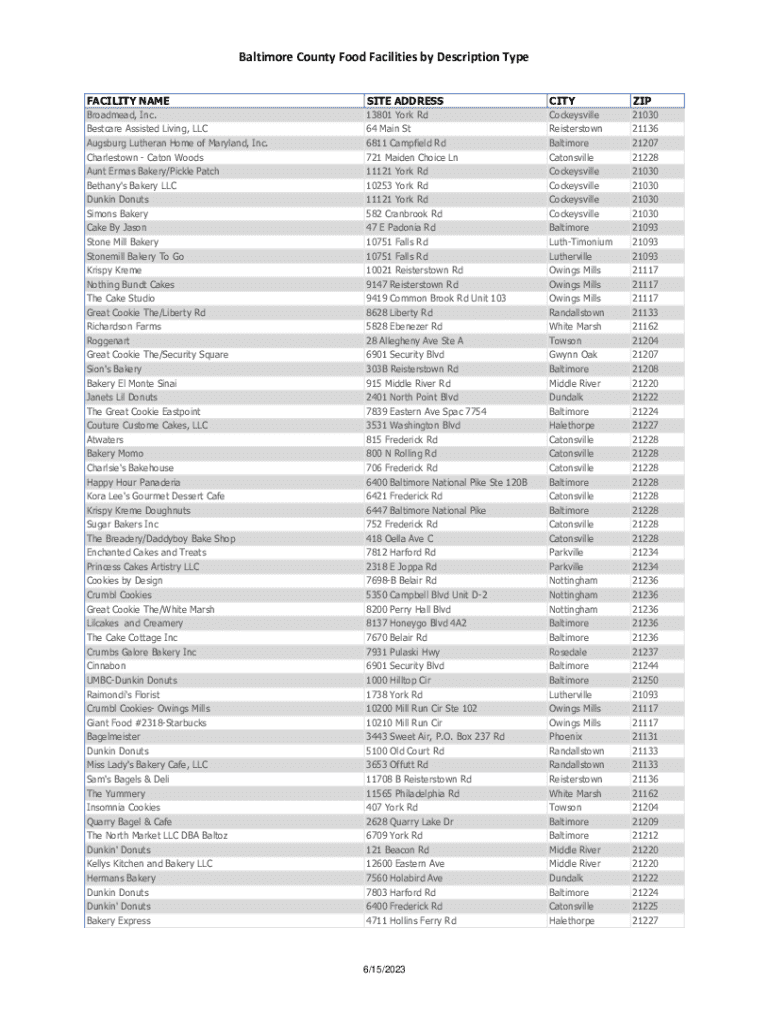 To fill out Baltimore County Food Facilities, establishments must provide detailed information about their food handling practices, equipment, and location.