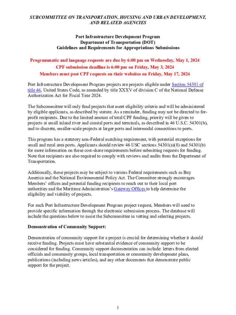 SUBCOMMITTEE ON TRANSPORTATION, HOUSING AND URBAN DEVELOPMENT, AND RELATED AGENCIES Port Infrastructure Development Program Department of Transportation (DOT) Guidelines and Requirements for Appropriations