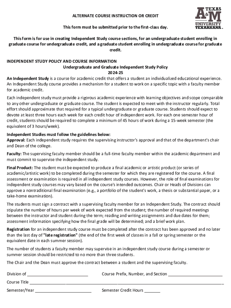 ALTERNATE COURSE INSTRUCTION OR CREDIT This form must be submitted prior to the firstclass day. This form is for use in creating Independent Study course sections, for an undergraduate student enrolling