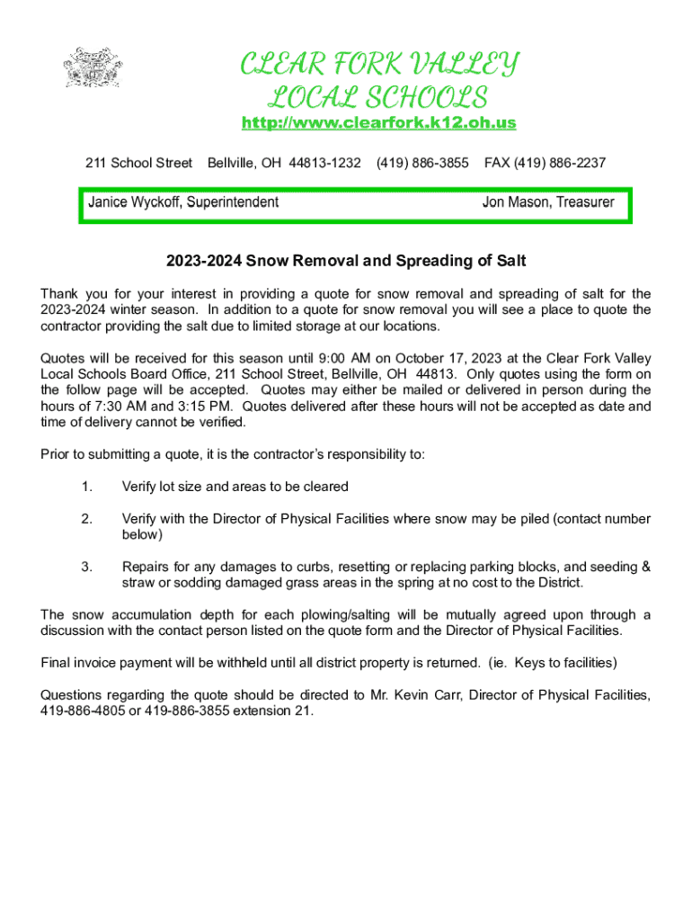 211 School StreetBellville, OH 448131232(419) 8863855FAX (419) 886223720232024 Snow Removal and Spreading of Salt Thank you for your interest in providing a quote for snow removal and spreading of