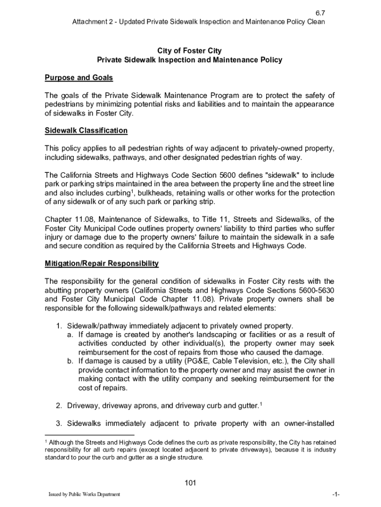 6.7 Attachment 2 Updated Private Sidewalk Inspection and Maintenance Policy Capacity of Foster City Private Sidewalk Inspection and Maintenance Policy Purpose and Goals The goals of the Private Sidewalk