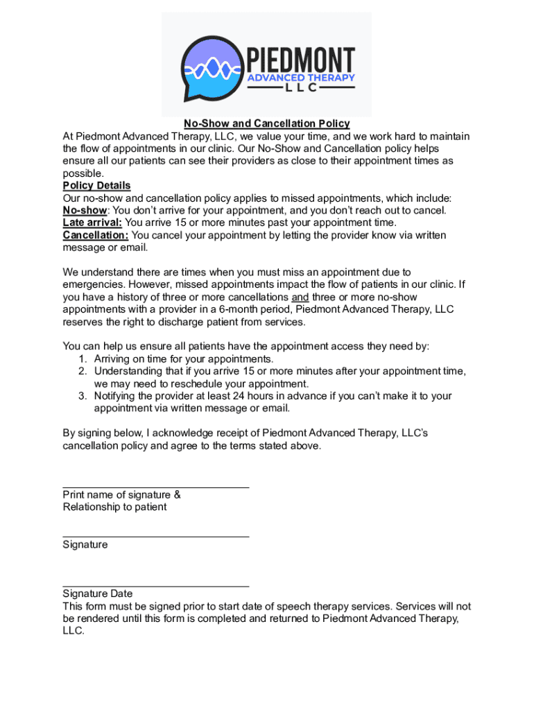 Get the free No-Show and Cancellation Policy At Piedmont Advanced ...