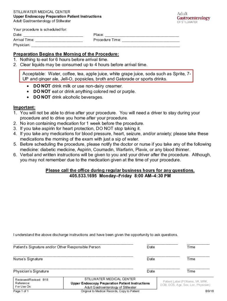 STILL WATER MEDICAL CENTER Upper Endoscopy Preparation Patient Instructions Adult Gastroenterology of Stillwater Your procedure is scheduled for: Date: ___ Place: ___ Arrival Time: ___ Procedure Time: