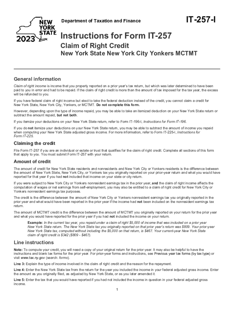 Department of Taxation and FinanceIT257IInstructions for Form IT257 Claim of Right CreditNew York State New York City Yonkers MCTMTGeneral information Claim of right income is income that you properly