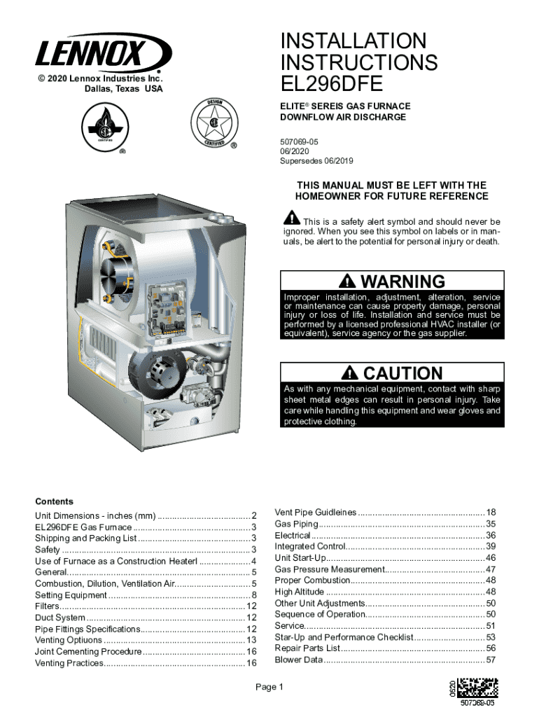 INSTALLATION INSTRUCTIONS EL296DFE 2020 Lennox Industries Inc. Dallas, Texas ISRAELITE SER EIS GAS FURNACE DOWNTOWN AIR DISCHARGE 50706905 06/2020 Supersedes 06/2019THIS MANUAL MUST BE LEFT WITH THE