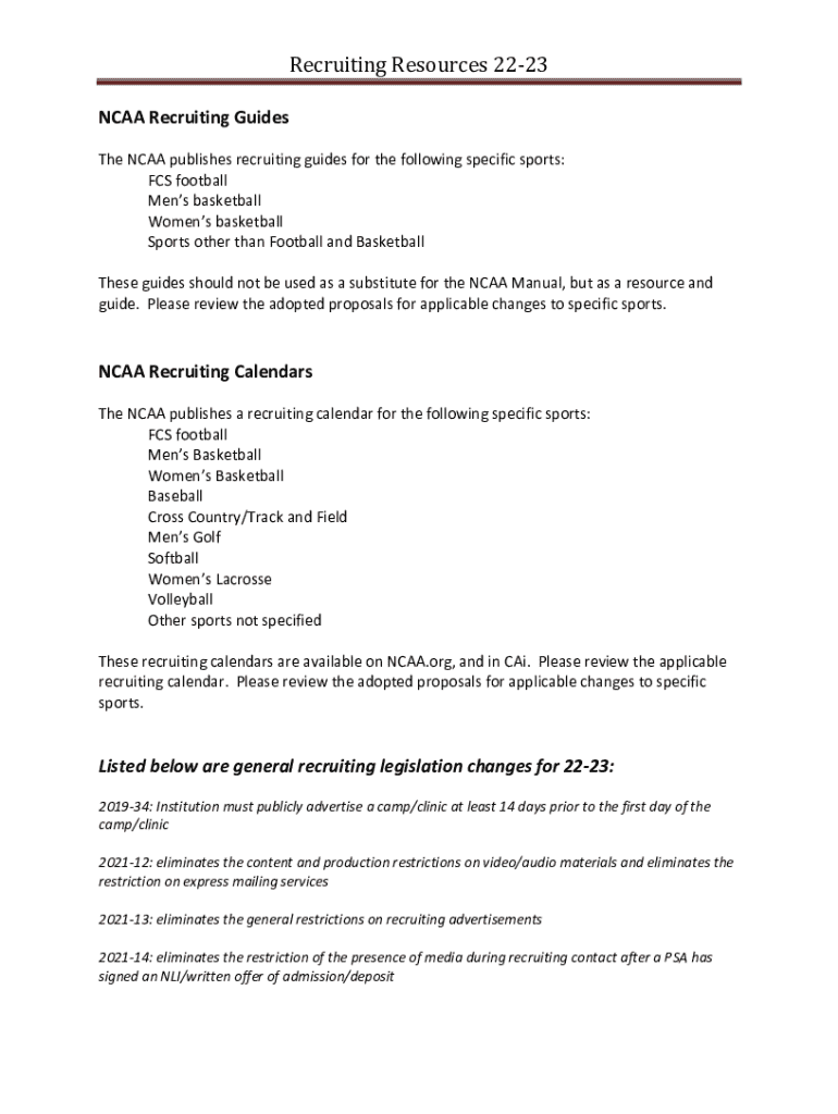 Recruiting Resources 2223 NCAA Recruiting Guides The NCAA publishes recruiting guides for the following specific sports: FCS football Men basketball Women's basketball Sports other than Football and