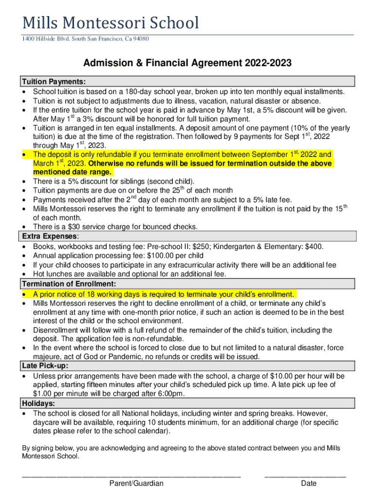 Mills Montessori School 1400 Hillside Blvd. South San Francisco, Ca 94080Admission & Financial Agreement 20222023 Tuition Payments: School tuition is based on a 180day school year, broken up into