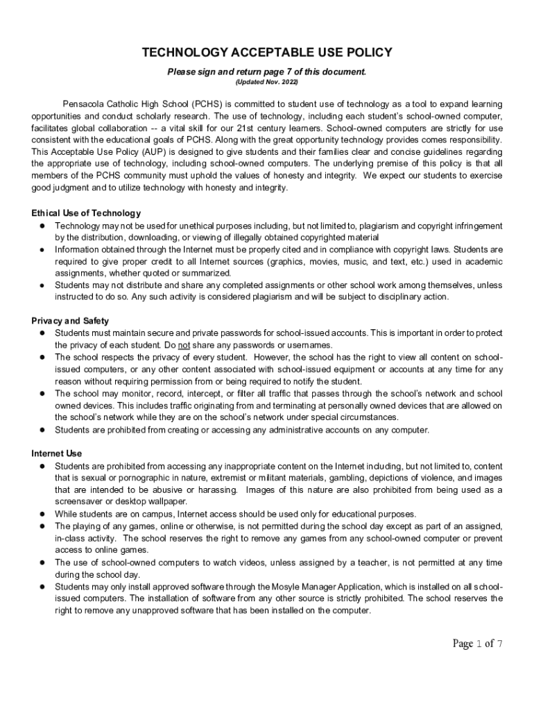 TECHNOLOGY ACCEPTABLE USE POLICY Please sign and return page 7 of this document. (Updated Nov. 2022)Pensacola Catholic High School (PCs) is committed to student use of technology as a tool to expand