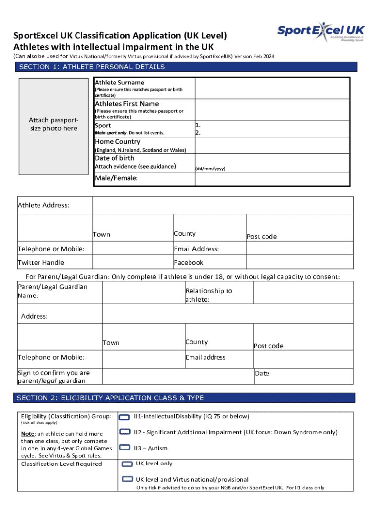 SportExcel UK Classification Application (UK Level) Athletes with intellectual impairment in the UK (Can also be used for Virtus National/formerly Virtus provisional if advised by SportExcelUK) Version