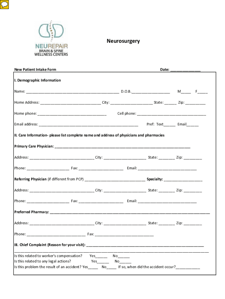 NeurosurgeryNew Patient Intake FormDate: ___I. Demographic Information Name: ___ D.O.B.___M___F___Home Address: ___ City: ___ State: ___ Zip: ___ Home phone: ___Cell phone: ___Email address: ___Pref: