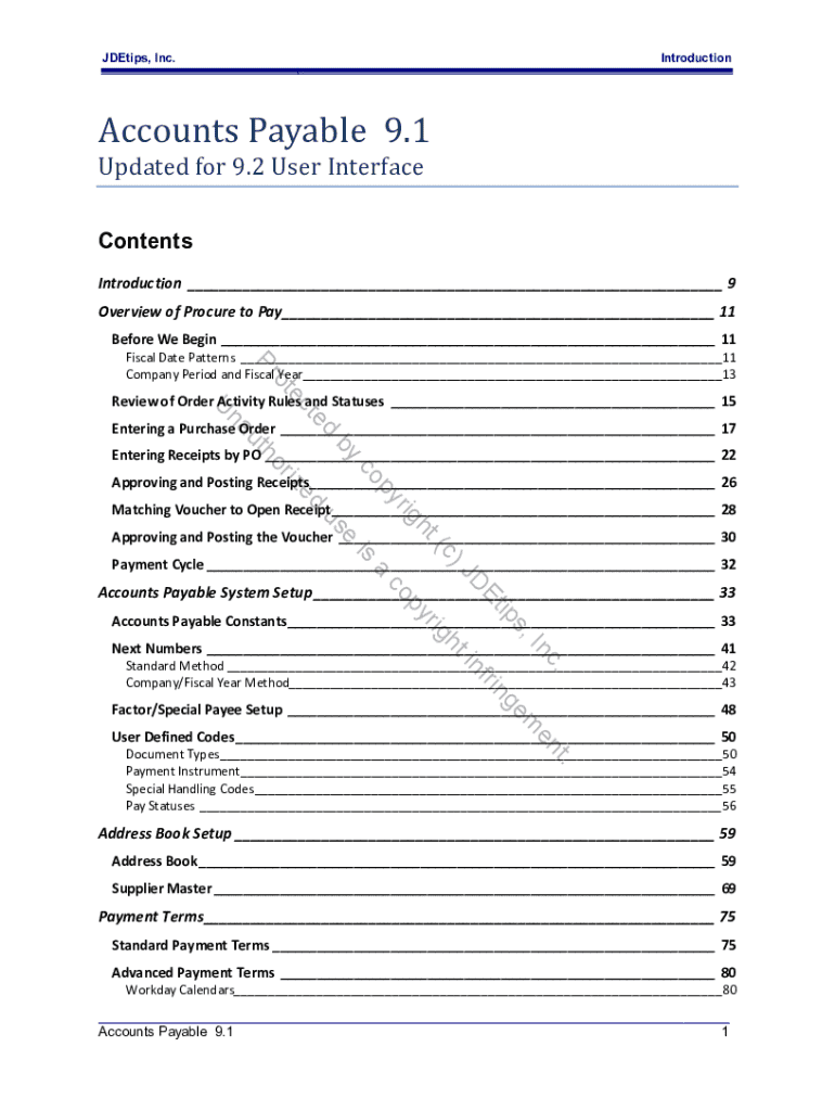 JDEtips, Inc.IntroductionAccounts Payable 9.1 Updated for 9.2 User Interface ContentsIntroduction ___ 9 Overview of Procure to Pay___ 11 Before We Begin ___ 11otPrFiscal Date Patterns ___ 11 Company