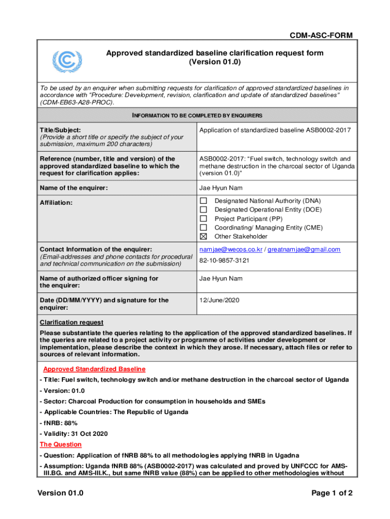 CDMASCFORM Approved standardized baseline clarification request form (Version 01.0)To be used by an enquirer when submitting requests for clarification of approved standardized baselines in accordance