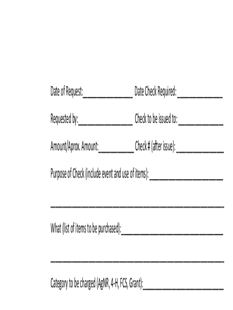 Date of Request:___ Date Check Required: ___ Requested by:___ Check to be issued to: ___ Amount/Approx. Amount:___ Check # (after issue): ___ Purpose of Check (include event and use of items): ___