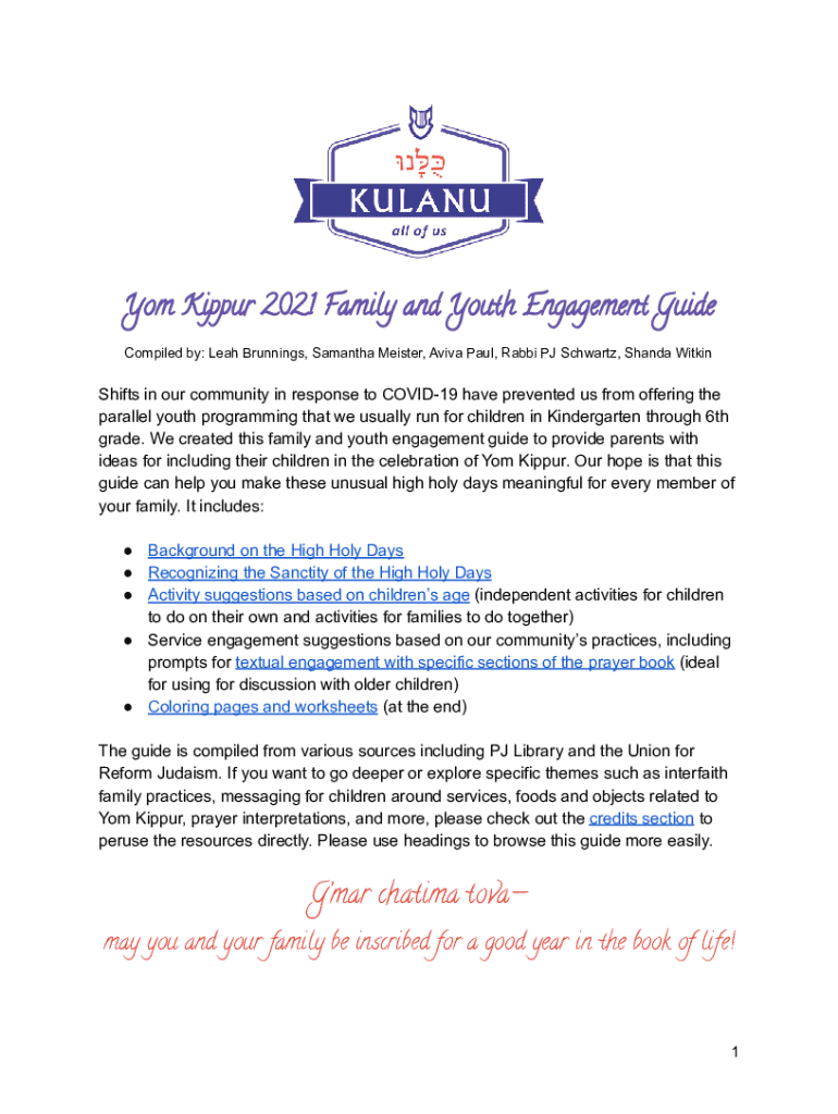 Yom Kippur 2021 Family and Youth Engagement Guide Compiled by: Leah Running, Samantha Master, Aviva Paul, Rabbi PJ Schwartz, Shana WitkinShifts in our community in response to COVID-19 have prevented