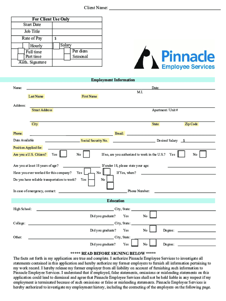 Client Name:For Client Use Only Start Date Job Title Rate of Pay$SalaryHourly Full time Part time Auth. Signature Diem SeasonalEmployment Information Name:Date: M.I. Last NameFirst Headdress:Phone:Street