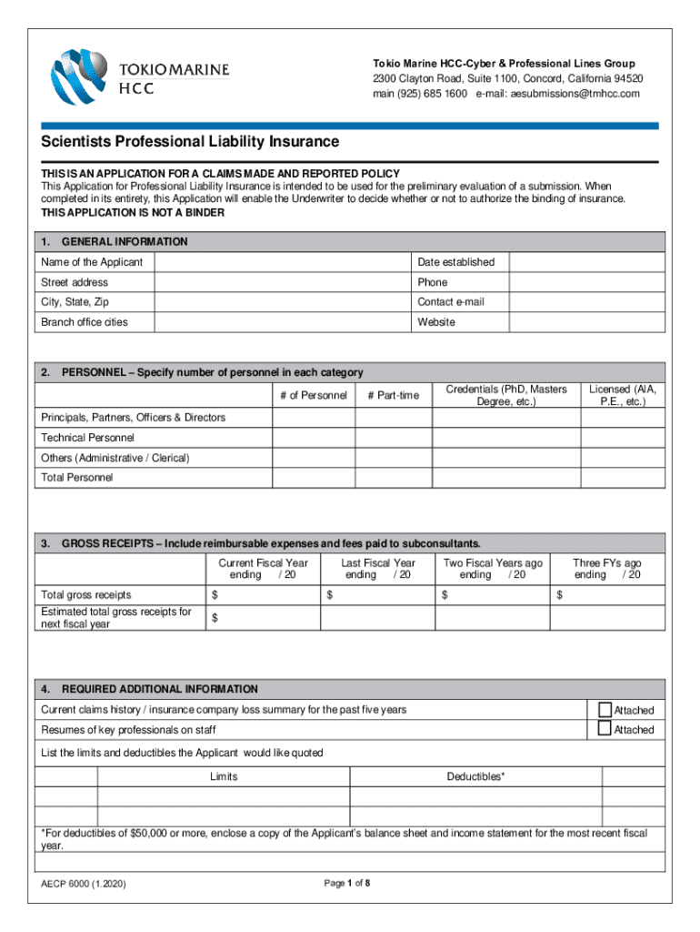 Tokio Marine HCCCyber & Professional Lines Group 2300 Clayton Road, Suite 1100, Concord, California 94520 main (925) 685 1600 email: aesubmissions@tmhcc.comScientists Professional Liability Insurance