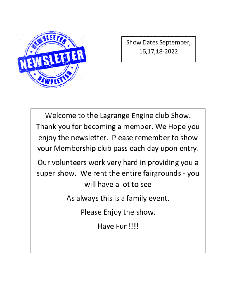 Show Dates September, 16,17,182022Welcome to the Lagrange Engine club Show. Thank you for becoming a member. We Hope you enjoy the newsletter. Please remember to show your Membership club pass each