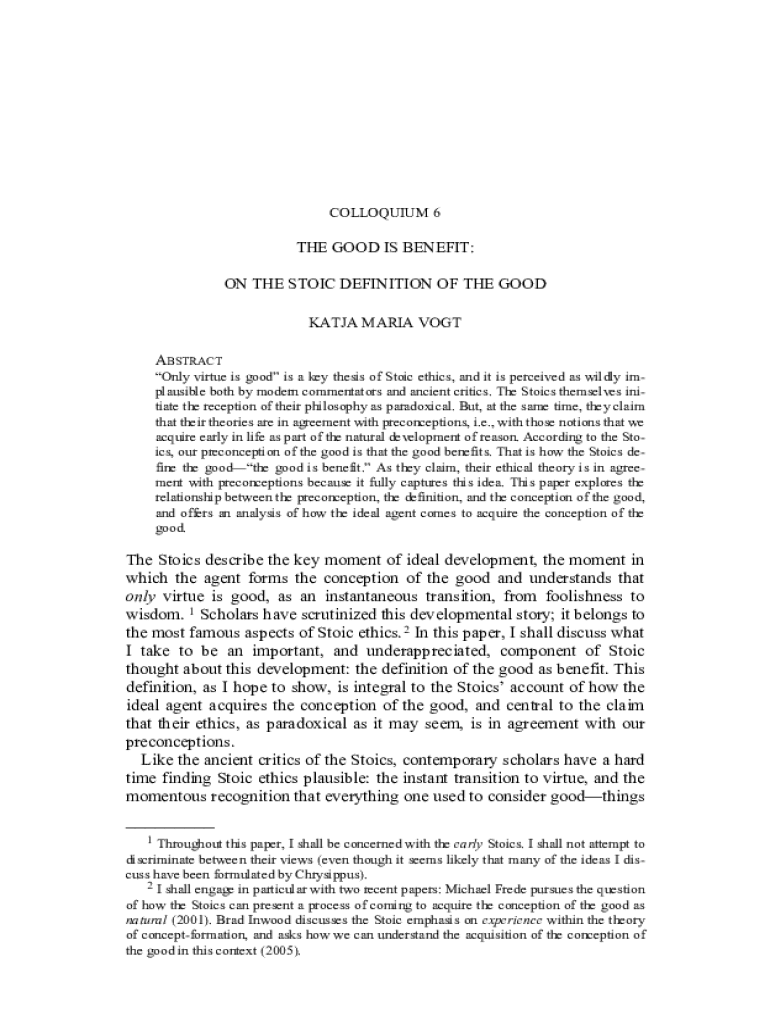 COLLOQUIUM 6THE GOOD IS BENEFIT: ON THE STOIC DEFINITION OF THE GOOD KATJA MARIA VOGT ABSTRACT Only virtue is good is a key thesis of Stoic ethics, and it is perceived as wildly implausible both by