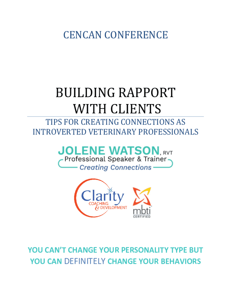 CENCAN CONFERENCEBUILDING RAPPORT WITH CLIENTS TIPS FOR CREATING CONNECTIONS AS INTROVERTED VETERINARY PROFESSIONALSYOU CANT CHANGE YOUR PERSONALITY TYPE BUT YOU CAN DEFINITELY CHANGE YOUR BEHAVIORS1NOTES:BUILDING