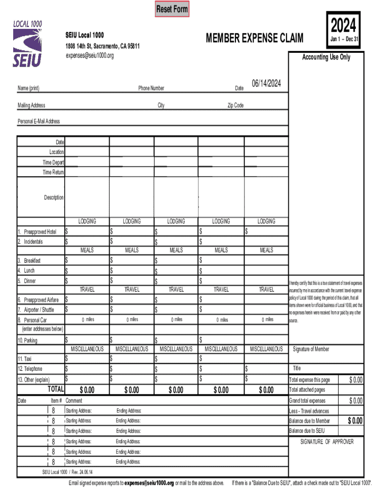 Reset Remember EXPENSE CLAIMED Local 1000 1808 14th St, Sacramento, CA 95811 expenses@seiu1000.orgName (print)2024 Jan 1 Dec 31Accounting Use Telephone NumberDateCityZip Compiling Address06/14/2024Personal