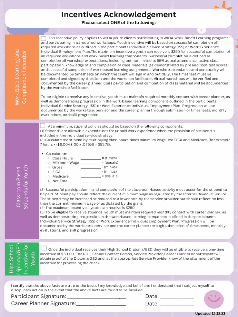 Incentives Acknowledgement Please select ONE of the following’D This incentive policy applies to WHOA youth clients participating in WHOA Workbasket Learning programs\”\'Öland participating in