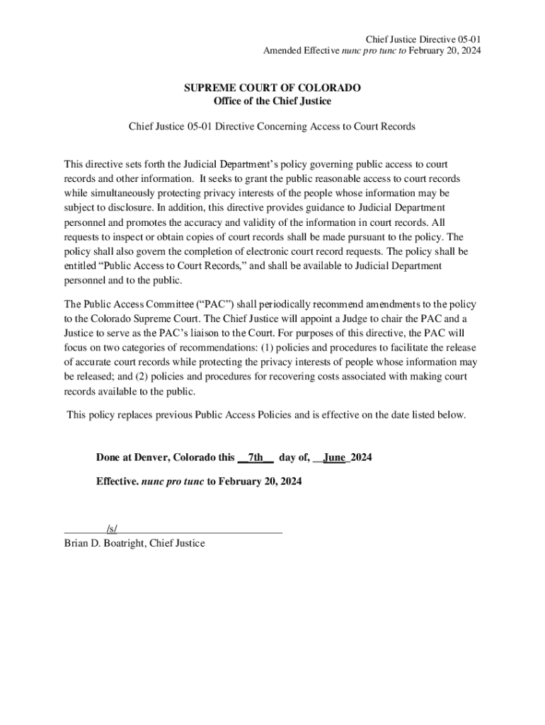 Chief Justice Directive 0501 Amended Effective nun pro tune to February 20, 2024SUPREME COURT OF COLORADO Office of the Chief Justice 0501 Directive Concerning Access to Court Records This directive