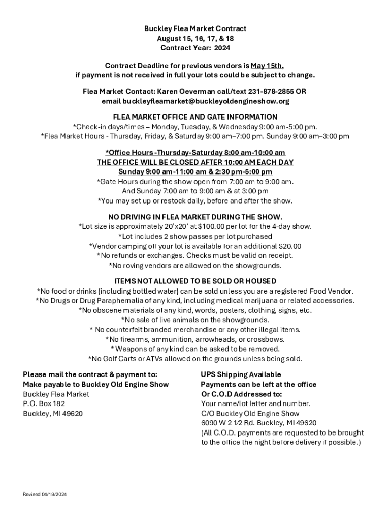 Buckley Flea Market Contract August 15, 16, 17, & 18 Contract Year: 2024 Contract Deadline for previous vendors is May 15th, if payment is not received in full your lots could be subject to change.