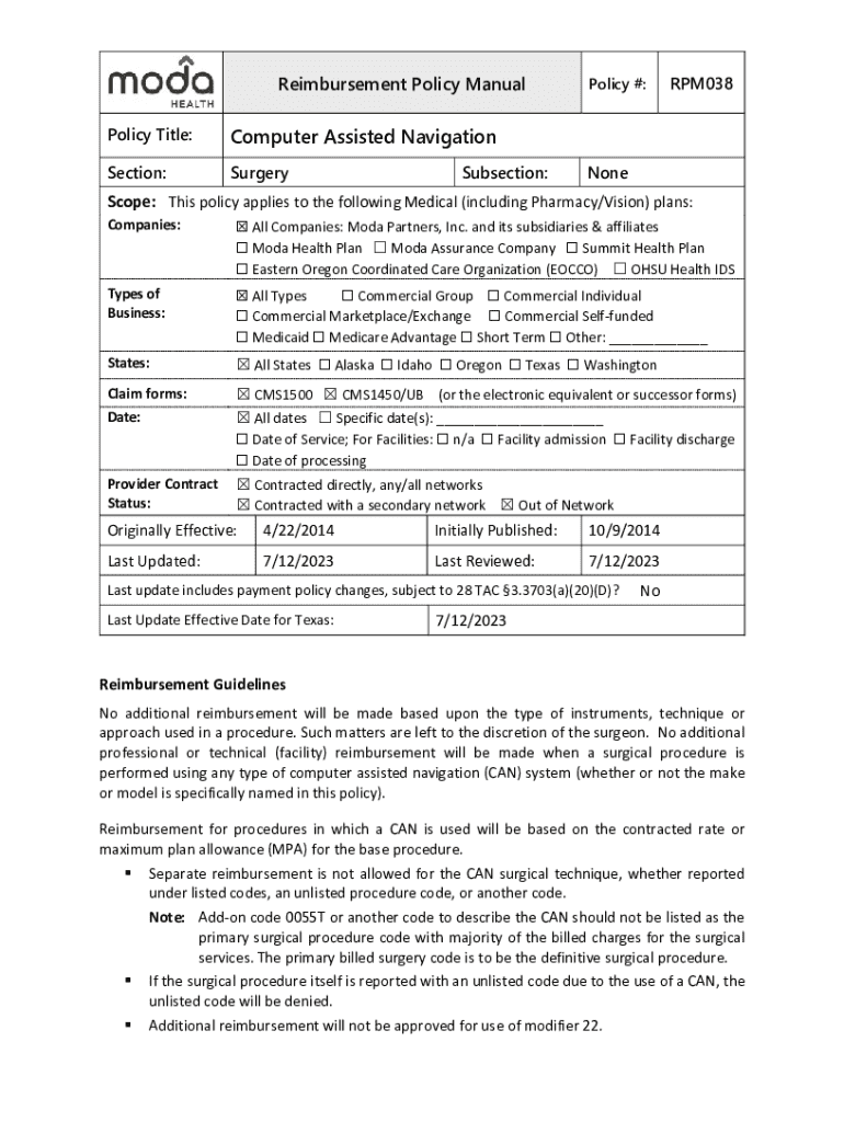 Reimbursement Policy Manual Policy Title:Computer Assisted NavigationSection:SurgerySubsection:Policy #:RPM038NoneScope: This policy applies to the following Medical (including Pharmacy/Vision) plans: