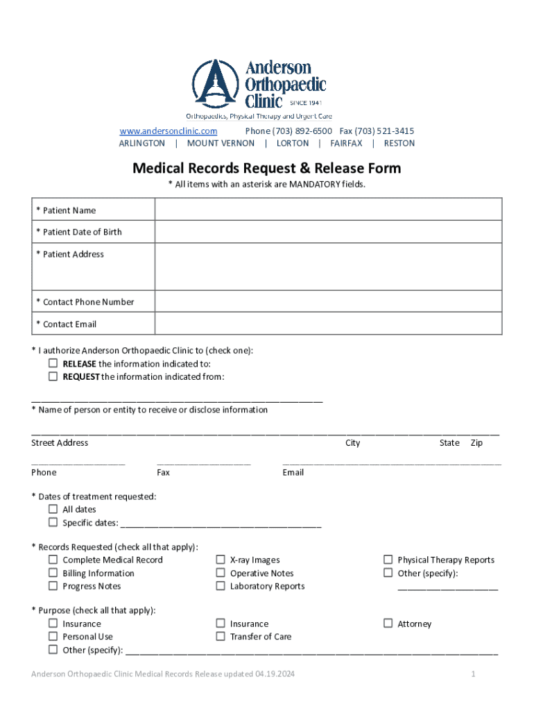 www.andersonclinic.com Phone (703) 8926500 Fax (703) 5213415 ARLINGTON | MOUNT VERNON | LORTON | FAIRFAX | RESTONMedical Records Request & Release Form * All items with an asterisk are MANDATORY fields.