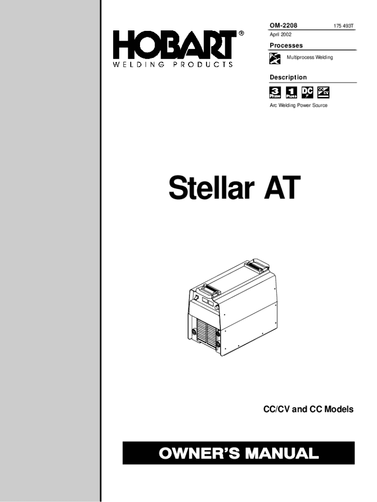 OM2208175 493TApril 2002Processes Multiprocess WeldingDescriptionArc Welding Power SourceStellar ATCC/CV and CC ModelsFrom Hobart to You Thank you and congratulations on choosing Hobart. Now you can