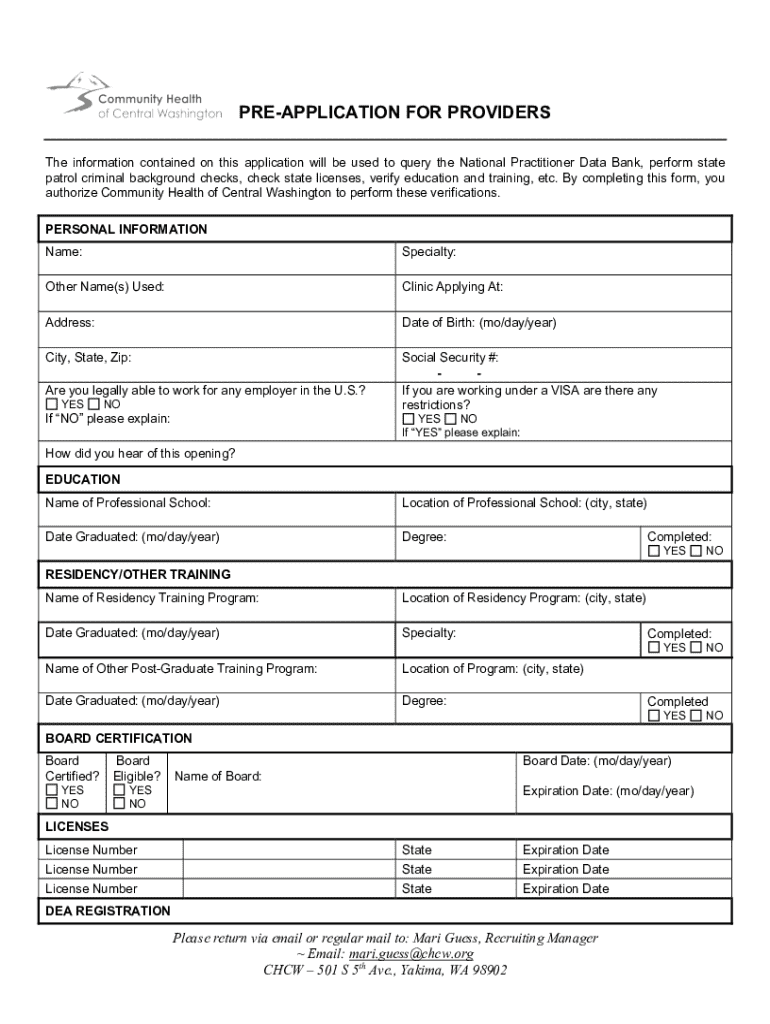 PREAPPLICATION FOR PROVIDERS The information contained on this application will be used to query the National Practitioner Data Bank, perform state patrol criminal background checks, check state licenses,