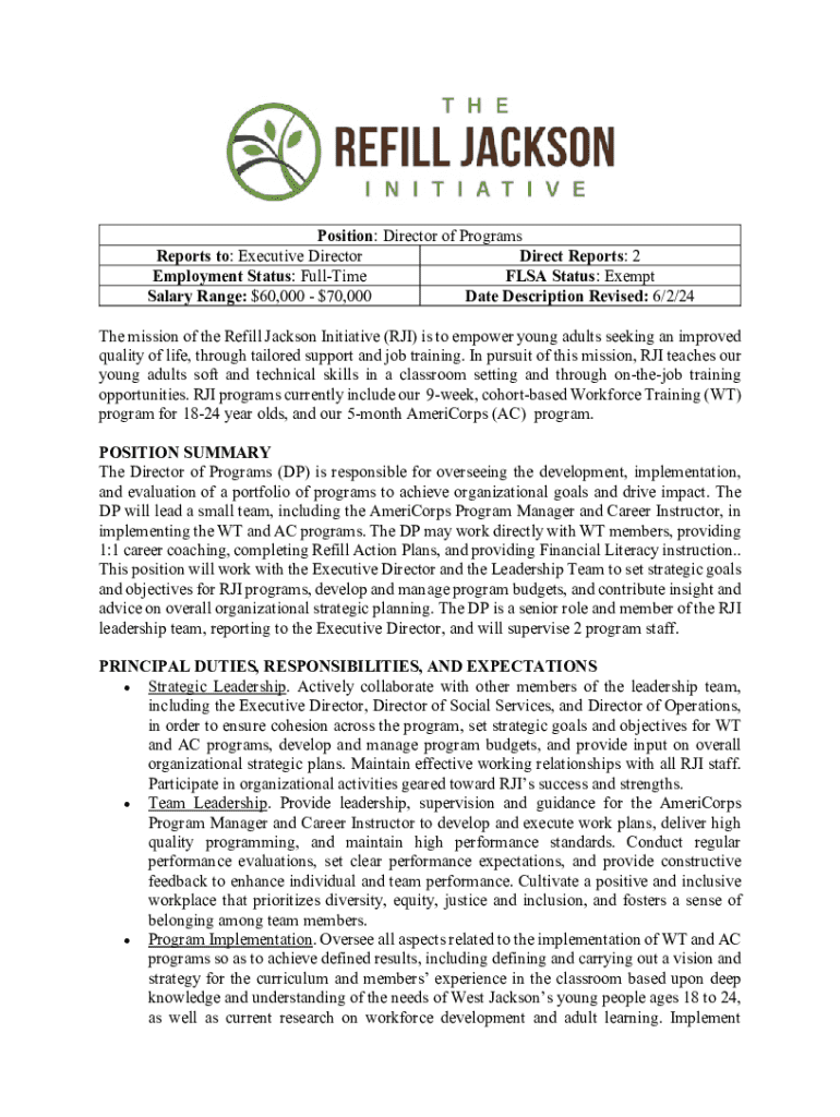 Position: Director of Programs Reports to: Executive Director Direct Reports: 2 Employment Status: FullTime FLSA Status: Exempt Salary Range: $60,000 $70,000 Date Description Revised: 6/2/24 The mission