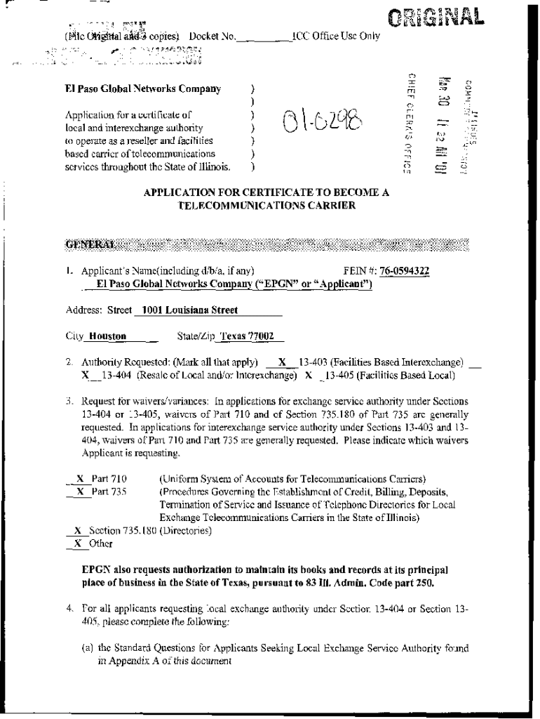 2El Pass Global Networks Company Application for a certificate of local and interexchange authority to operate as a reseller and facilities based carrier of telecommunications services throughout