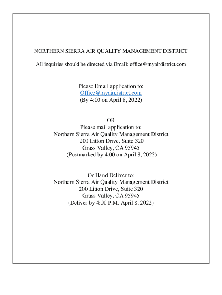 NORTHERN SIERRA AIR QUALITY MANAGEMENT DISTRICT All inquiries should be directed via Email: office@myairdistrict.comPlease Email application to: Office@myairdistrict.com (By 4:00 on April 8, 2022)OR