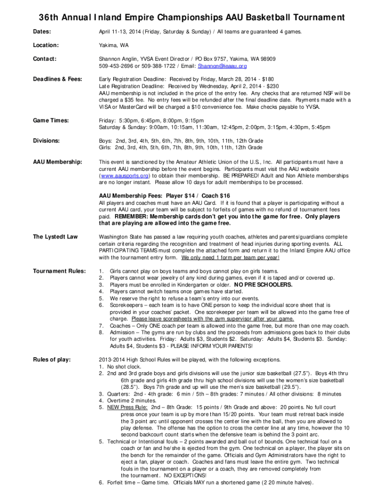 36th Annual Inland Empire Championships AAU Basketball Tournament Dates:April 1113, 2014 (Friday, Saturday & Sunday) / All teams are guaranteed 4 games. Location:Yakima, Contact:Shannon Anglia, YES