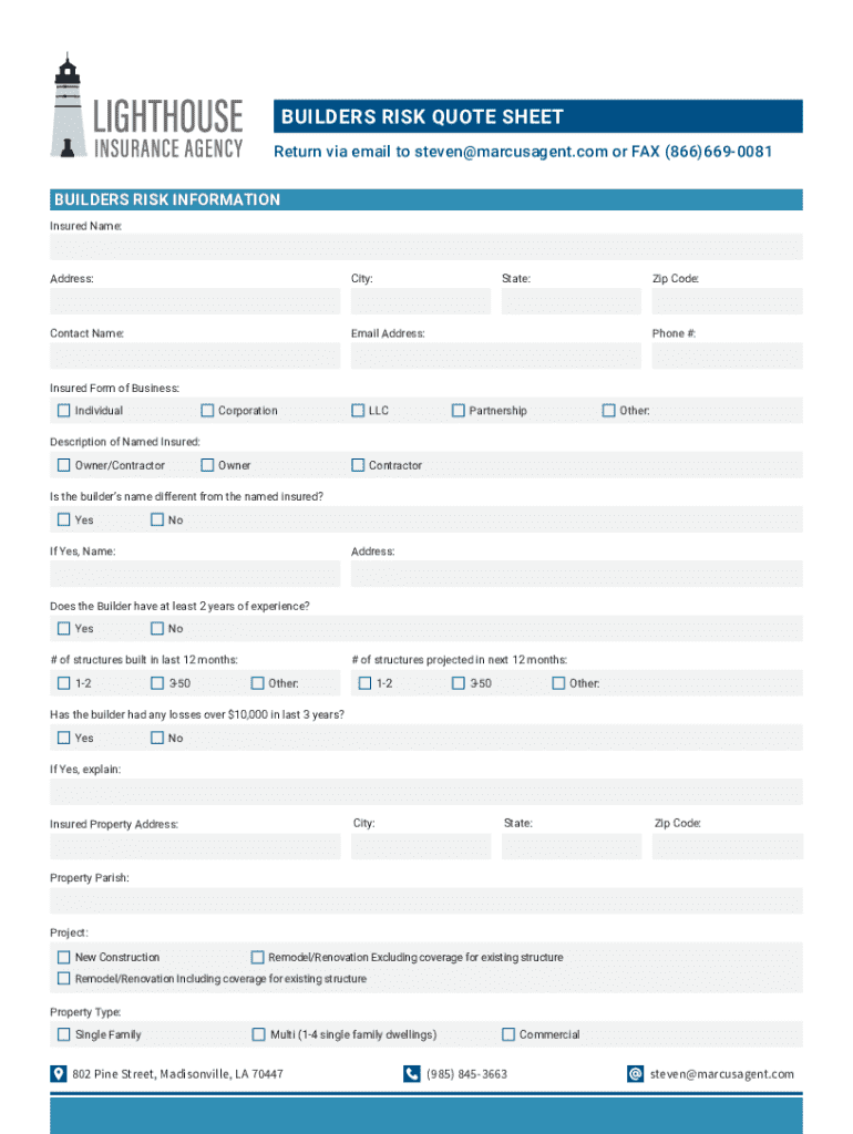 The builders risk quote sheet is a document that outlines the details of a construction project, including the types of risks involved and the insurance coverage needed.