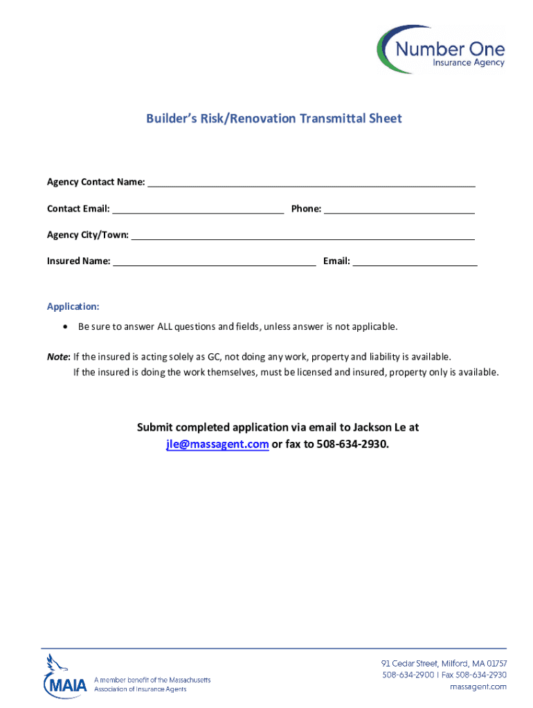 Builders Risk/Renovation Transmittal SheetAgency Contact Name: ___ Contact Email: ___ Phone: ___ Agency City/Town: ___ Insured Name: ___ Email: ___Application: Be sure to answer ALL questions and