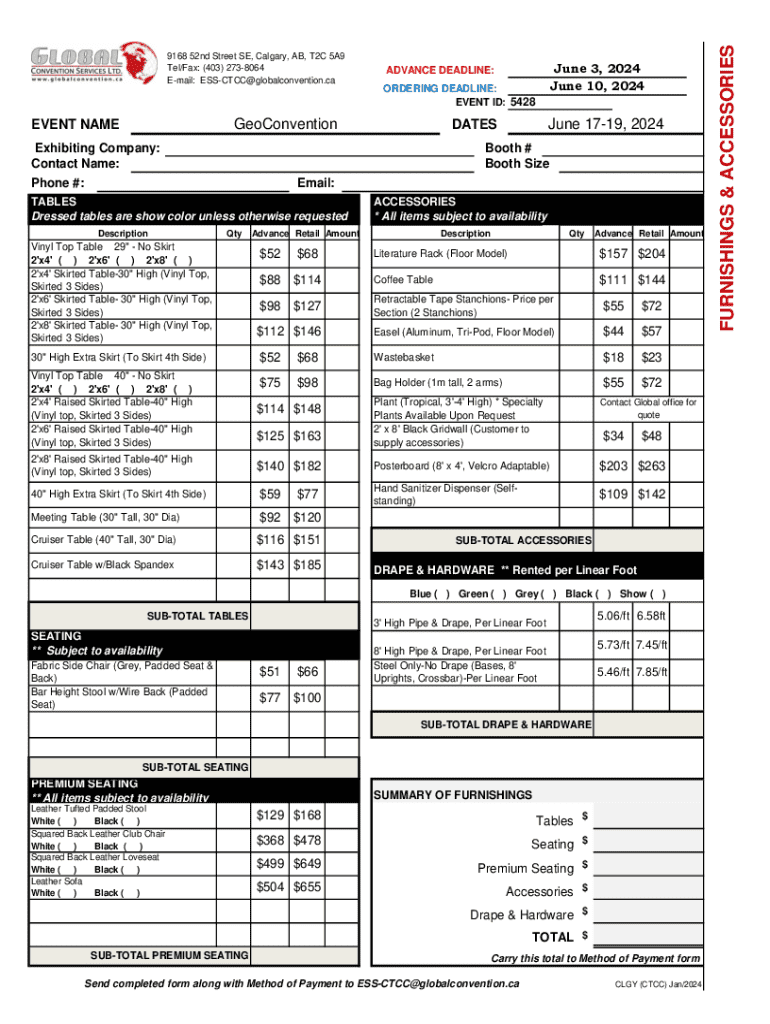 GeoConventionEVENT NAME June 3, 2024 June 10, 2024ADVANCE DEADLINE: ORDERING DEADLINE: EVENT ID: 5428June 1719, 2024DATESExhibiting Company: Contact Name:Booth # Booth Telephone #:Email:TABLES Dressed