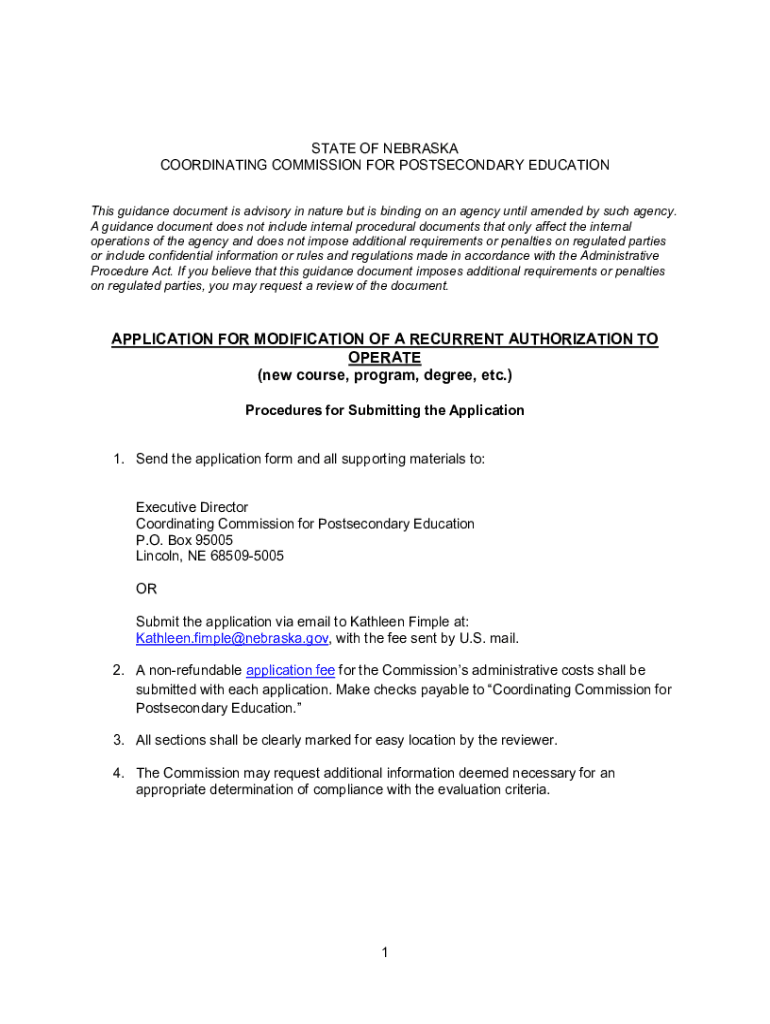 STATE OF NEBRASKA COORDINATING COMMISSION FOR POSTSECONDARY EDUCATION This guidance document is advisory in nature but is binding on an agency until amended by such agency. A guidance document does