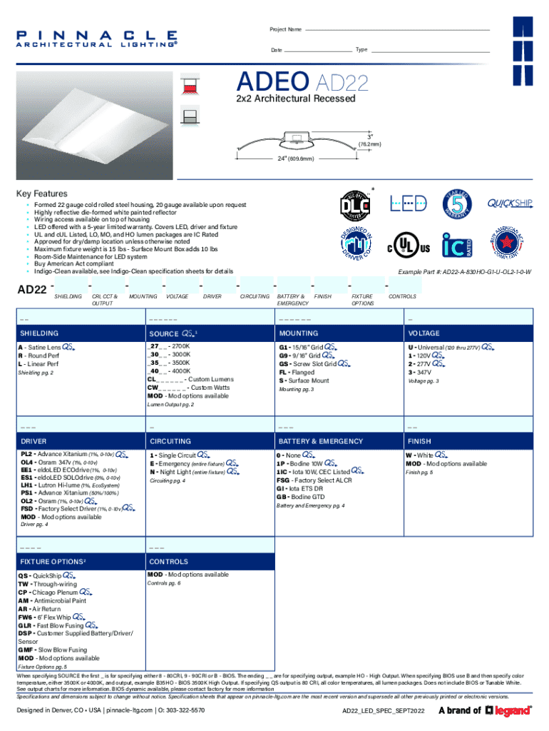 Project Name TypeDateADEO AD222x22x2 Architectural Recessed ADEO (AD22)Side View 33(76.2mm)(76.2mm24\" (609.6mm)24\" (609.6mm)*Key Features Formed 22 gauge cold rolled steel housing, 20 gauge available