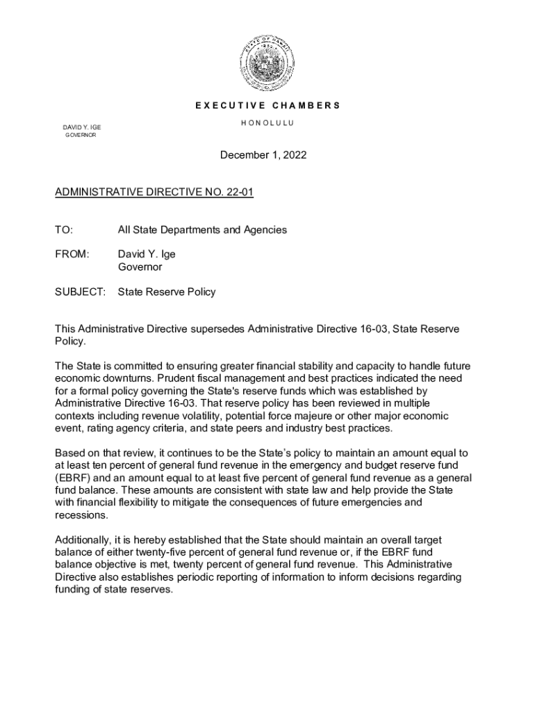EXECUTIVE CHAMBERS HONOLULUDAVID Y. IGE GOVERNOR December 1, 2022 ADMINISTRATIVE DIRECTIVE NO. 2201 TO:All State Departments and AgenciesFROM:David Y. IGE GovernorSUBJECT:State Reserve PolicyThis