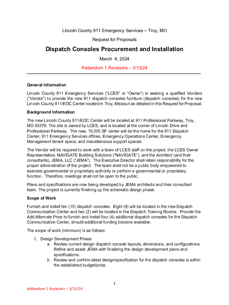 Lincoln County 911 Emergency Services Troy, MO Request for ProposalsDispatch Consoles Procurement and Installation March 4, 2024, Addendum 1 Revisions 3/13/24General Information Lincoln County 911