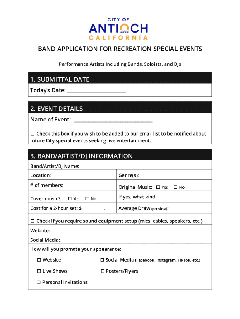 BAND APPLICATION FOR RECREATION SPECIAL EVENTS Performance Artists Including Bands, Soloists, and DJs1. SUBMITTAL DATE Todays Date: ___2. EVENT DETAILS Name of Event: ___ Check this box if you wish