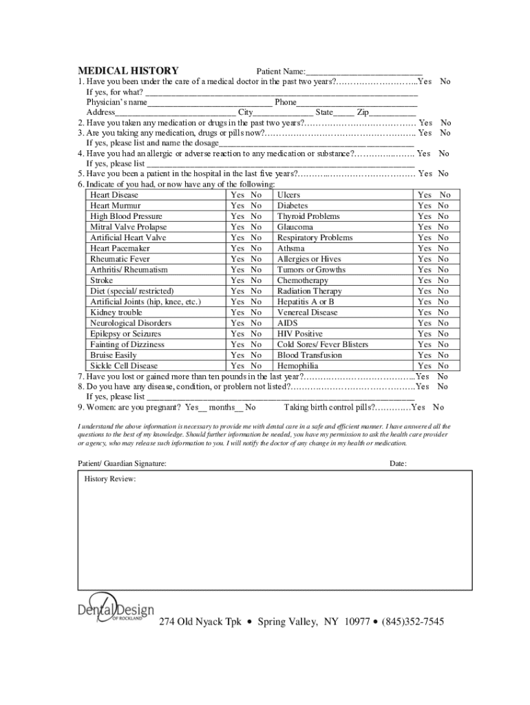 MEDICAL HISTORYPatient Name:___ 1. Have you been under the care of a medical doctor in the past two years?..Yes No If yes, for what? ___ Physicians name___ Phone___ Address___ City___ State___ Zip___