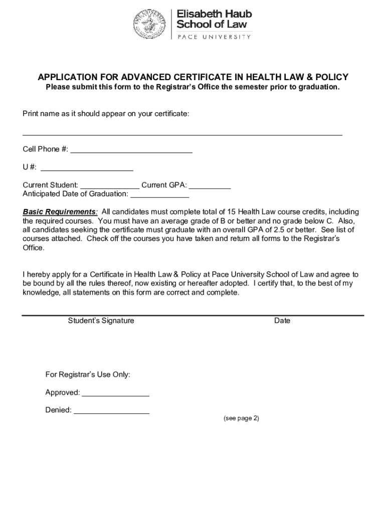 Get the free Health Certificate Application - Pace Law School - law pace